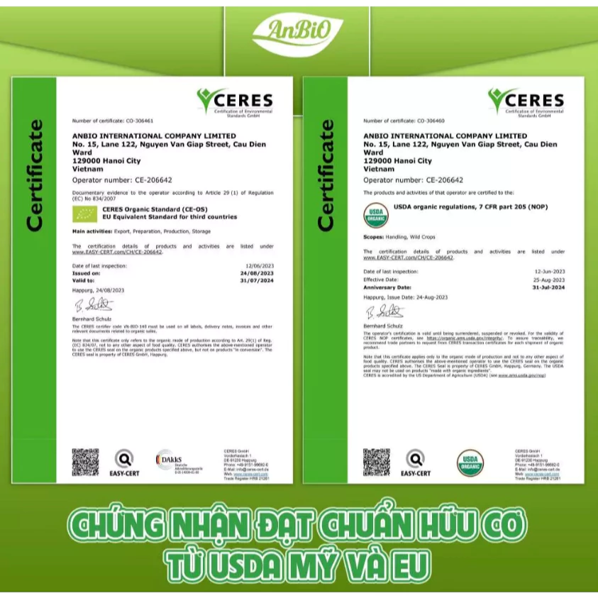 - Chứng nhận hữu cơ: USDA, EU