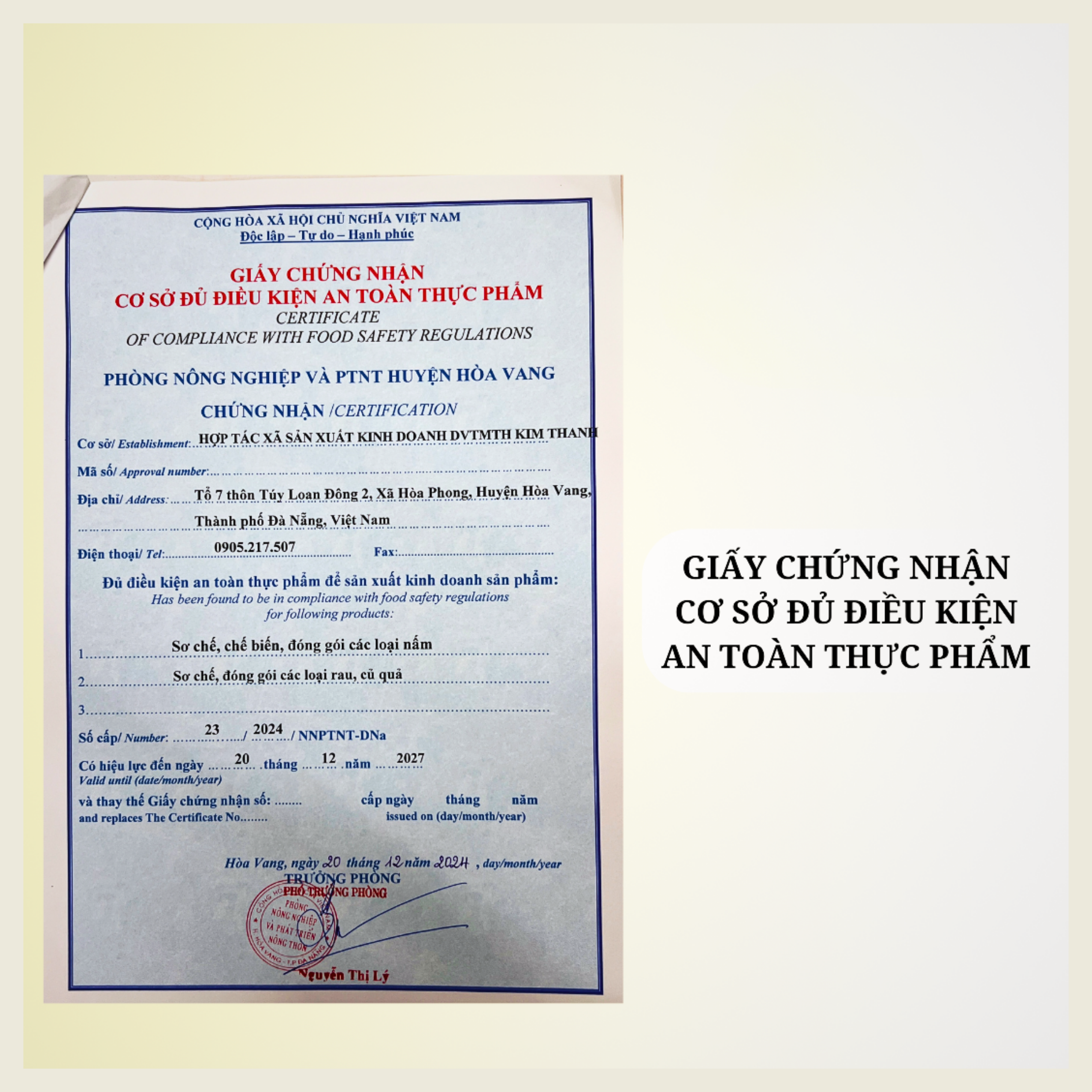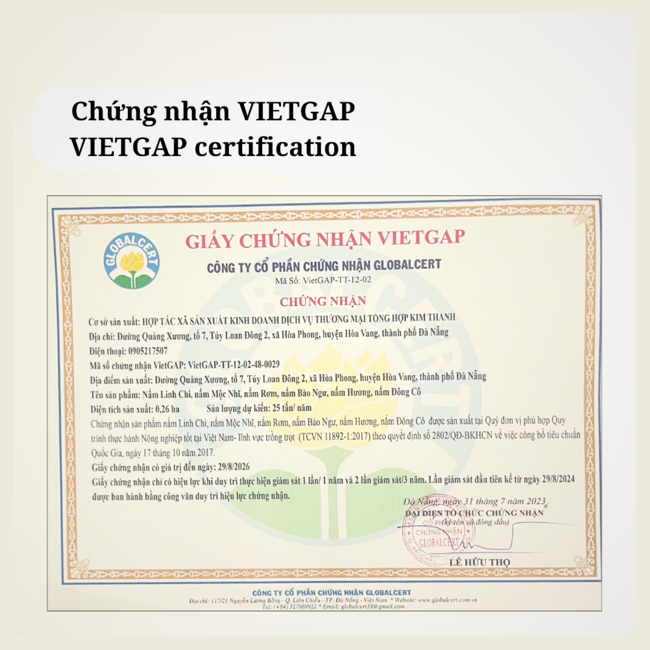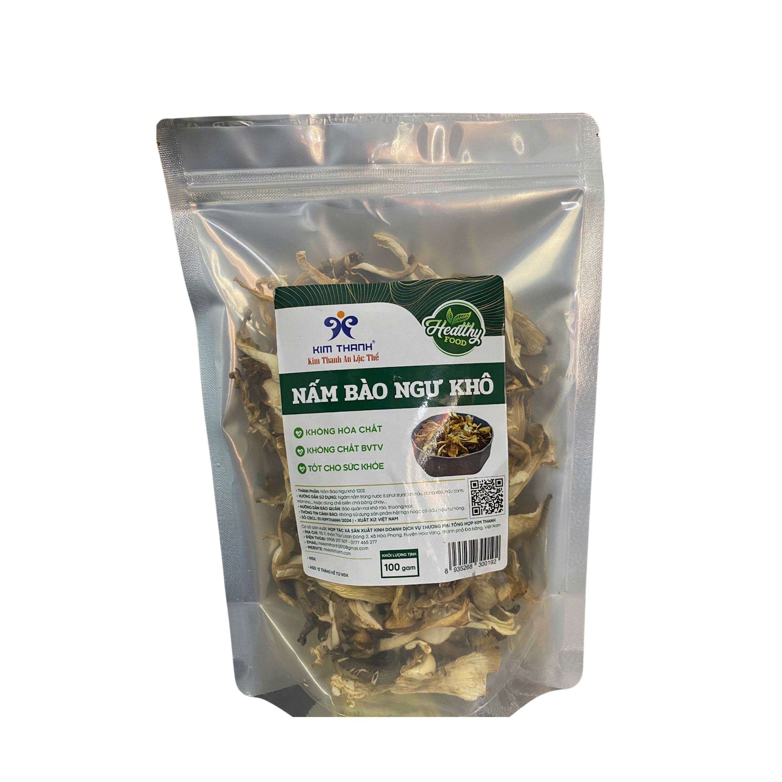 – Thành phần: 100% nấm bào ngư khô tự nhiên, sản xuất bởi Hợp tác xã Kim Thanh, đạt chuẩn OCOP và VietGAP, quy trình trồng trọt hữu cơ, không chất bảo quản.